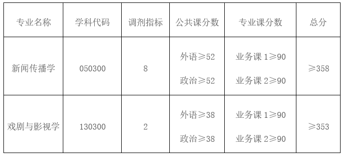 4.我院新闻传播学、戏剧与影视学两专业招生指标如下表所示,调剂考生单科分数和总分均需达到表中所列要求: