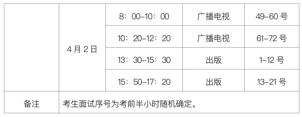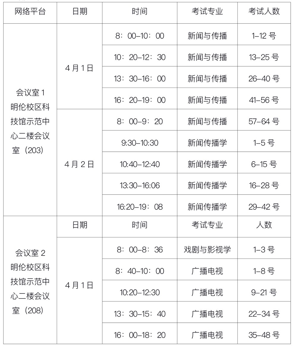 面试正式开始前30分钟完成随机排序,工作人员将在7:30和13:00准时通过WeLink平台发布考生面试时间。收到信息的考生须及时回复并按时接入待考室核验身份备考,在会控工作人员导引下接入面试考场,每位考生只进入一次面试考场,依次完成外语测试、专业知识面试、学术学位复试专业考试(仅限学术学位考生)和同等学力加试(仅限同等学力考生)。各专业将错峰使用网上会议室,原则上学硕面试时间为12分钟/生,专硕面试时间为10分钟/生,具体安排如下: