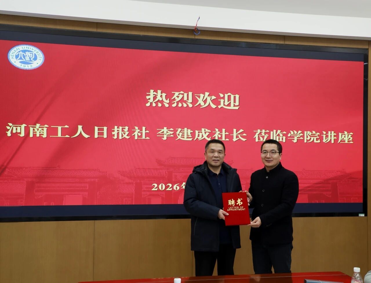 讲座首先举行了聘任仪式,学院党委书记乔石豪向李建成颁发了兼职教授聘书。