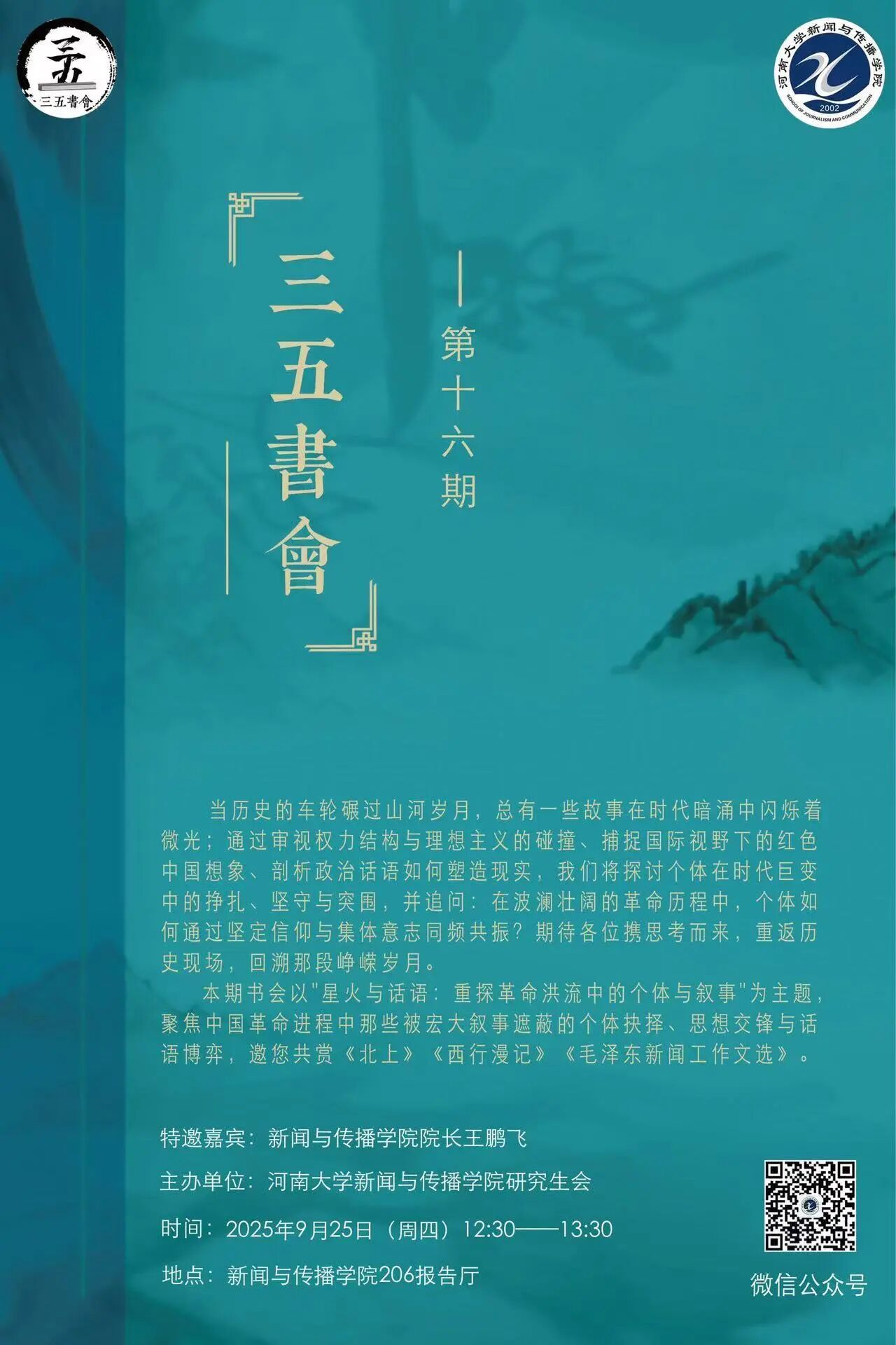 9月25日,第十六期“三五书会”在友兰学堂北楼C206室举行。本期书会以“星火与话语:重探革命洪流中的个体与叙事”为主题,围绕《北上:党中央与张国焘斗争始末》《西行漫记》与《毛泽东新闻工作文选》三本书展开交流。我院院长王鹏飞教授担任评议嘉宾,2025级戏剧与影视专业研究生薛梦乐担任主持,共30位研究生参会。