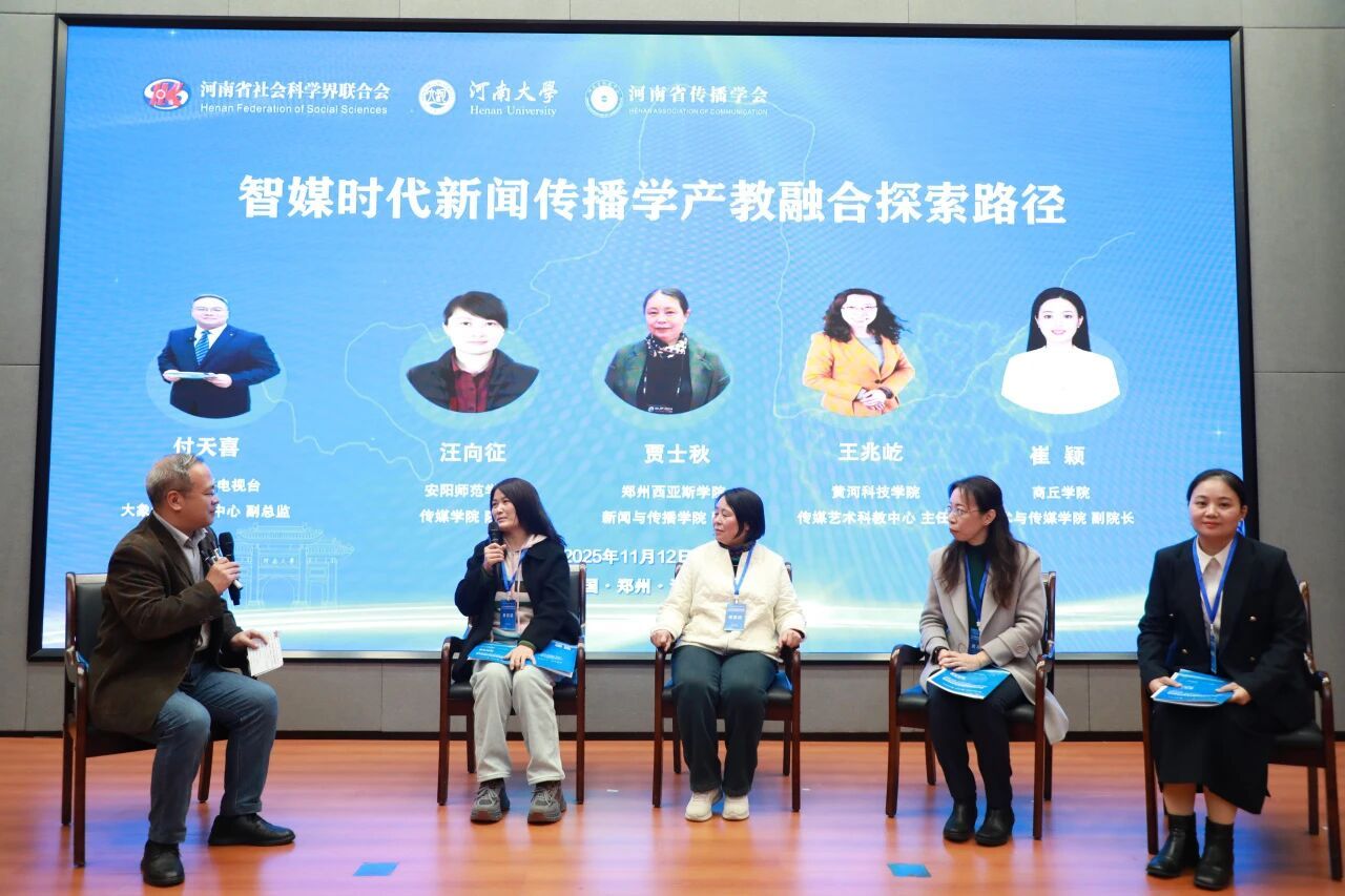 安阳师范学院传媒学院院长汪向征、郑州西亚斯学院新闻与传播学院院长贾士秋、黄河科技学院传媒艺术科教中心主任王兆屹、商丘学院艺术与传媒学院副院长崔颖,围绕新闻传播学产教融合的痛点与突破点展开热烈讨论。他们指出,当前专业教学中存在实践教学支撑薄弱、校企利益与理念错位、融合创新动力不足等共性问题,应着力探索体制机制改革,通过构建资源共享平台、优化校企协同育人模式、强化政策支持与激励机制,推动学界与业界在课程开发、项目合作、师资互聘等方面形成深度联动。