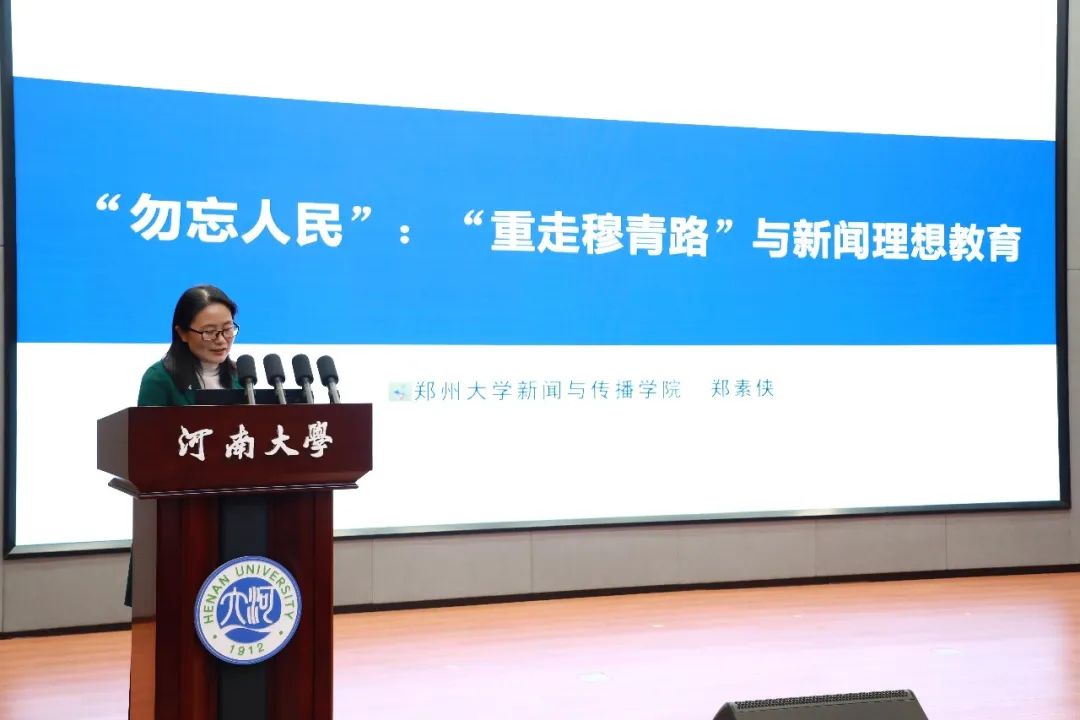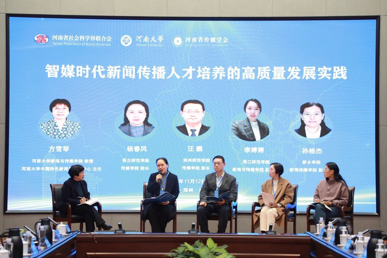 主旨演讲下半场由我院副院长高红波主持。河南省传播学会副会长、《郑州大学学报》主编郑素侠结合穆青实验班课题组培养新闻传播人才的实践指出,新闻教育应回归“以理想教育为基石”的初心,将人民立场教育、职业理想教育、马克思主义新闻观教育统一于教学之中。中原工学院新闻与数字传播学院副院长蔡爱芳介绍了学院在黄河文化数智传播主题下的系列探索,倡导打通“教-学-研-产”全链路,完善“以赛促学、以创育人”的创新机制。河南开封科技传媒学院传播学院院长严励从校媒企实践平台搭建、特色与差异化的专业培养方案、多元力量的师资队伍建设等方面分享了应用型人才培养的方法及路径。河南工业大学新闻与传播学院院长李晓云从实践育人、品牌育人、协同育人等维度,详细介绍了学院培养具有数智素养、创新能力、跨学科思维的全媒化新闻传播人才的实践经验。河南大学中国特色新闻学研究中心主任方雪琴教授结合2025年国家社科基金项目及教育部社科项目立项情况透视新闻传播学研究热点,强调顺应技术变革、关注国家战略与重大社会问题、重视深度交叉融合的重要性。