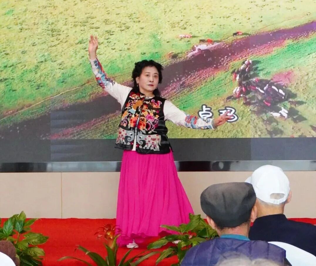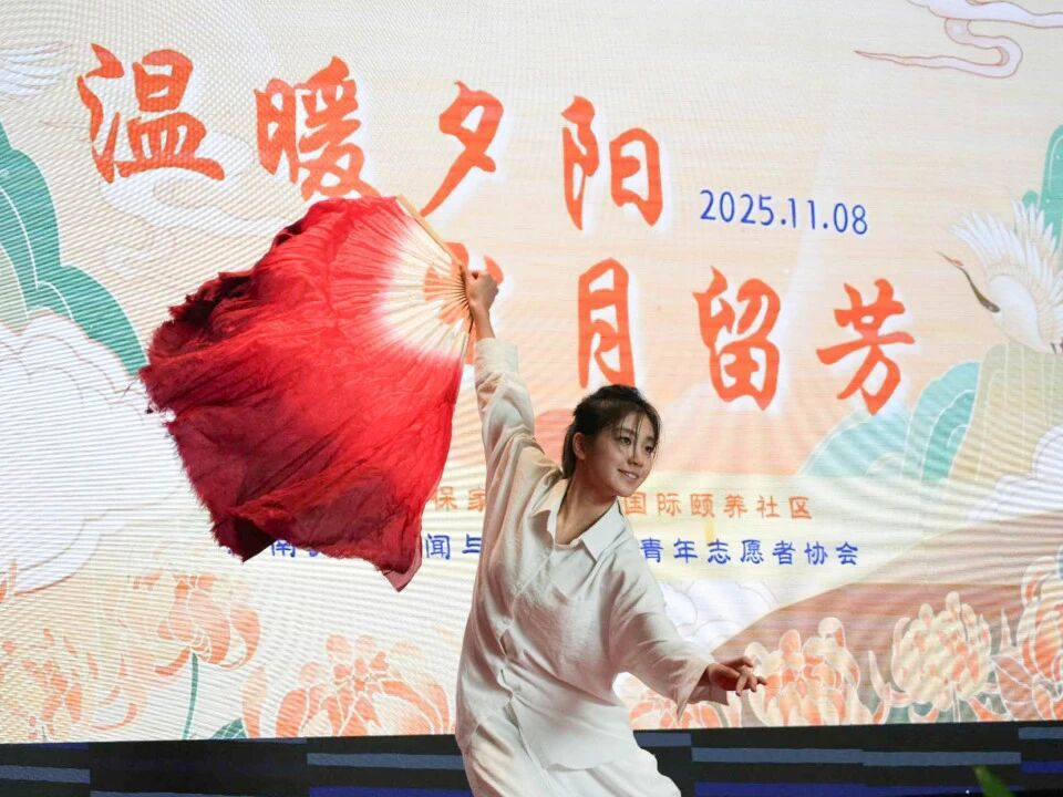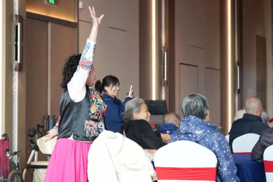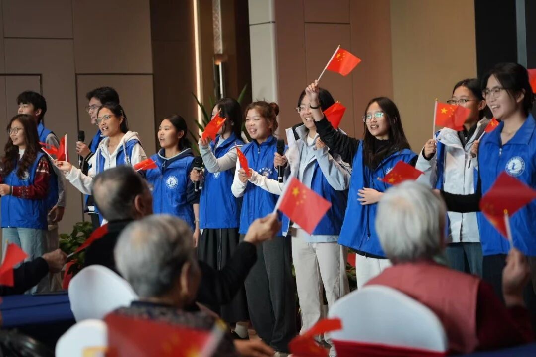 才艺表演环节,志愿者与老人们同台献艺,携精彩节目传递真挚祝福。多人合唱《我爱你中国》,情感饱满,五星红旗挥舞间点燃全场;舞蹈《我的未来式》《盛世》与左奶奶的《卓玛》各具风采,尽显青春活力与灵动韵味;奶奶朗诵的《青春中国》铿锵动容,集体三句半《情暖金秋》诙谐暖心。