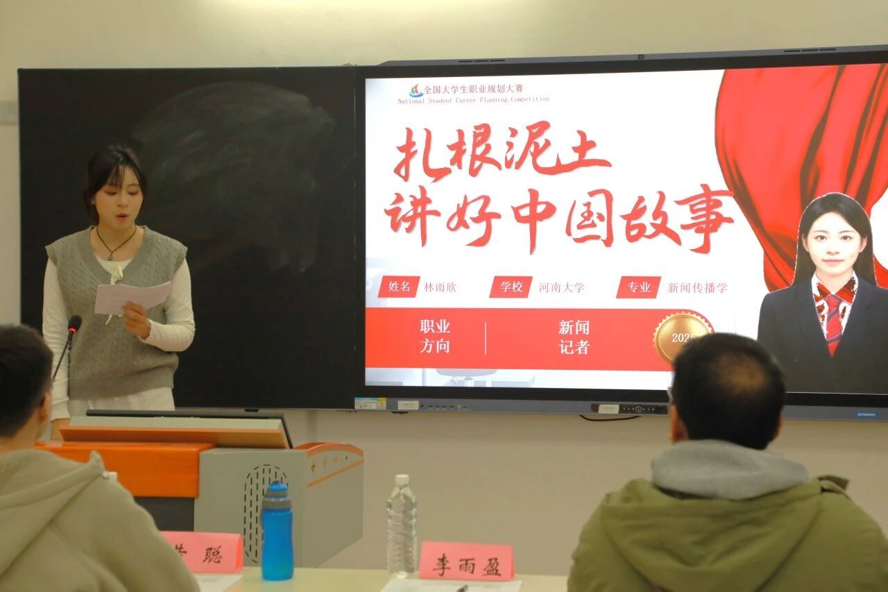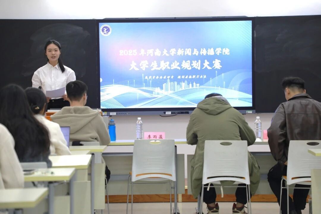 为全面提升学生职业规划能力,助力青年学子绘就职业发展蓝图,11月20日,我院在郑州龙子湖校区友兰北楼C座109室举办2025年河南大学大学生职业规划大赛院赛。本次比赛由我院团委书记李雨盈,本科生辅导员杨喜喜、郑涛,以及研究生黄聪、李岩松担任评委,由2025级播音与主持艺术专业本科生郑琪瑶担任主持人。
