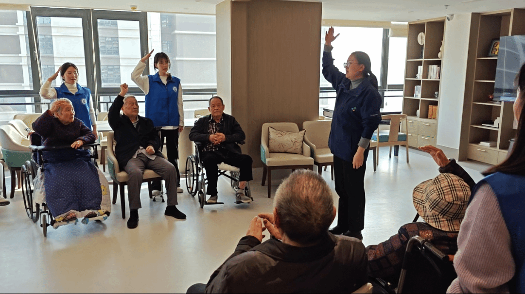 此次活动中,志愿者各司其职,分赴自理区与护理区,与老人们温情互动,为他们送去欢乐与温暖。在自理区,老人们兴致勃勃地参与到趣味手指操、词语联想、说词拍手等互动游戏中。指尖跃动间舒展了身体,笑语盈盈中拉近了距离,也勾起了老人们深藏于心的往昔记忆。