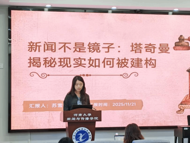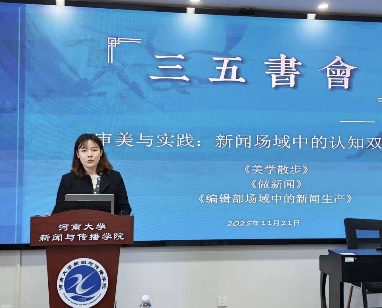 11月21日中午,第十八期“三五书会”在郑州龙子湖校区友兰学堂北楼C206室举行。本期书会以“审美与实践:新闻场域中的认知双维”为主题,围绕《美学散步》《做新闻》及《编辑部场域中的新闻生产》三部著作展开交流。我院新闻系教师贾媛媛担任评议嘉宾,2025级新闻与传播专业研究生李婉莹担任主持,共39位研究生参会。