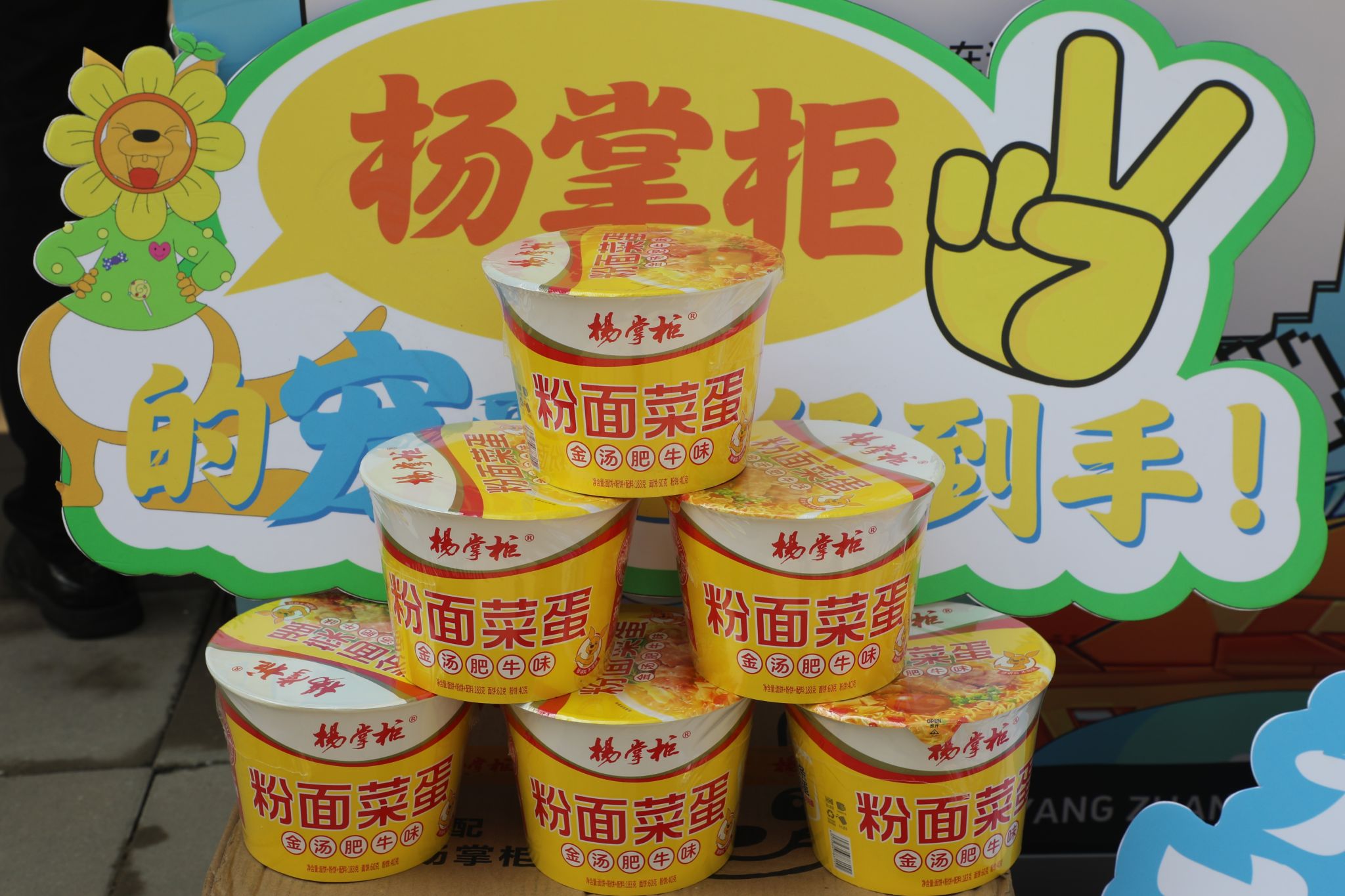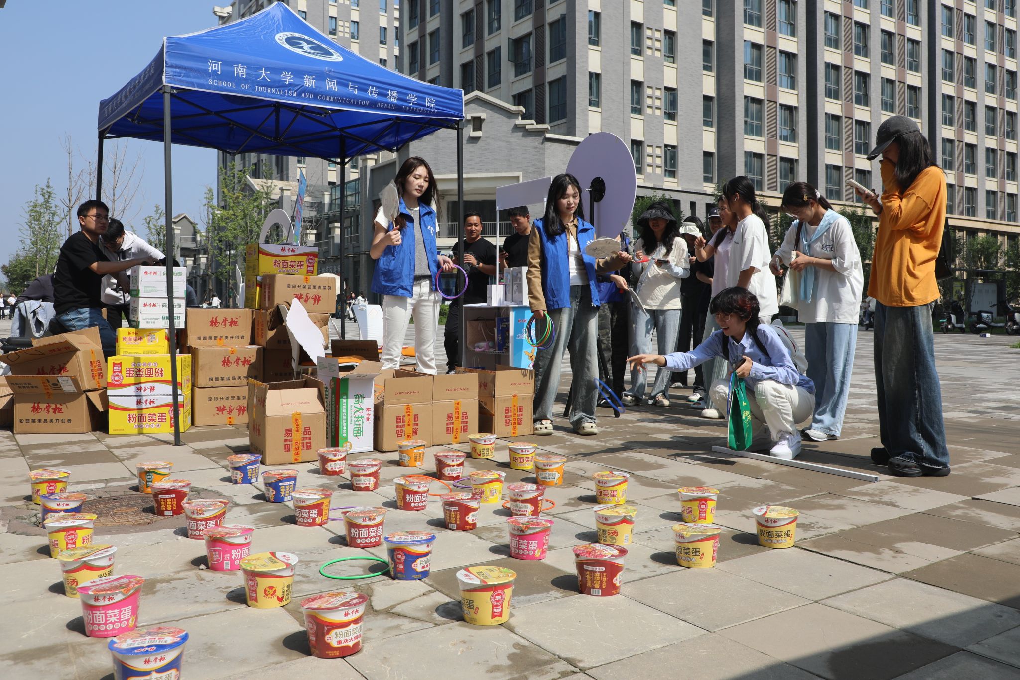 现场更具挑战性的是“趣味套圈”游戏,地上整齐摆放了六纵列的杨掌柜泡面。同学们纷纷瞄准目标,用力将套圈抛出,划出一道道优美的弧线,将“泡面”收入囊中。同学们不仅在游戏中收获乐趣,也在轻松愉快的氛围中拉近距离,诠释了“校园搭子”互助同乐的精神。