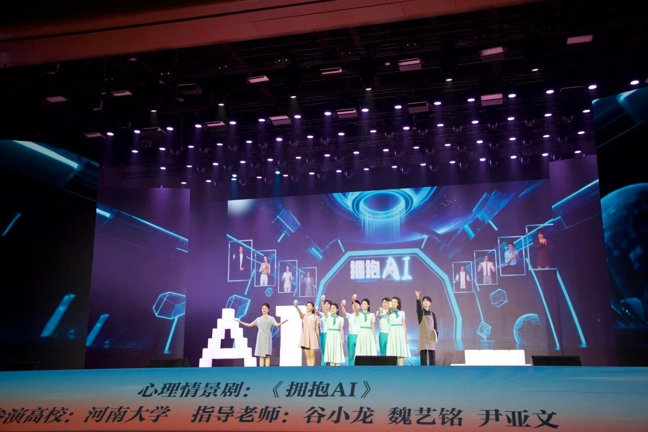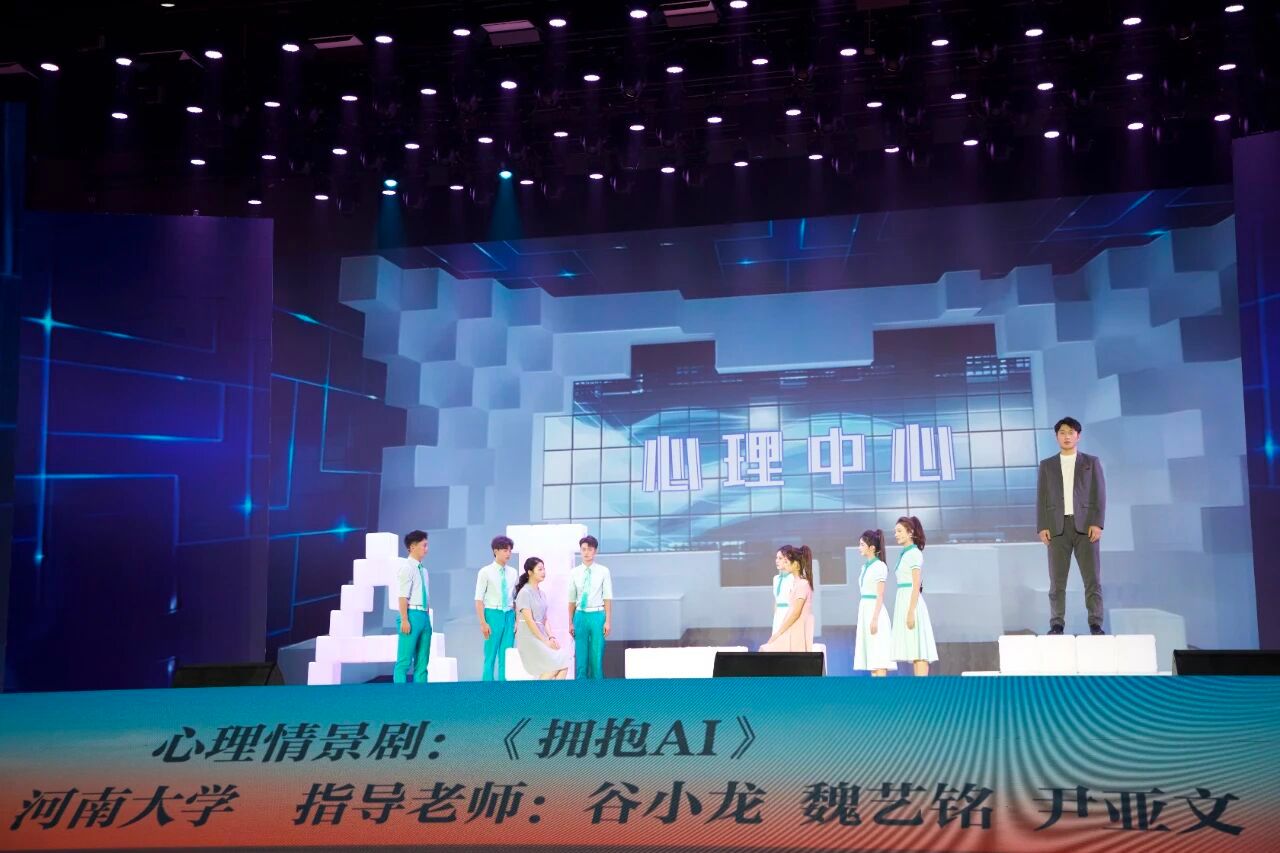 为进一步深化全省高校心理育人工作成效,提升大学生心理健康素养,10月20日,省委教育工委、省教育厅在河南中医药大学体育馆举办2025年河南省高校心理健康教育宣传周启动仪式暨心理情景剧展演。作为2025年河南省高校心理情景剧精品类获奖作品,我院原创剧目《拥抱AI》在活动现场精彩呈现。