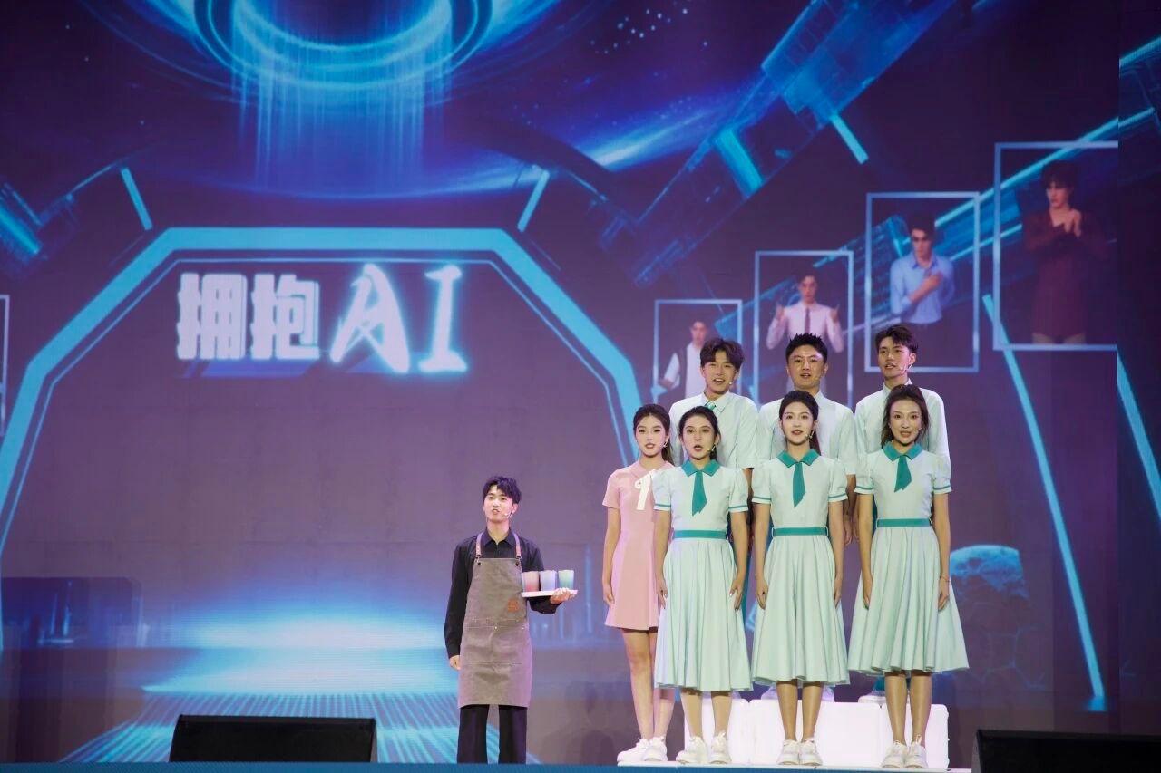 《拥抱AI》紧扣人工智能时代背景,聚焦青年学子的现实困惑与价值追寻。剧目讲述了播音专业学生扬扬因AI主播冲击而陷入职业焦虑,在辅导员的引导下,与同学们共同参与“AI辅导员”升级任务,最终重新找回自信、实现自我成长的温情故事。作品以幽默的对话、鲜活的情节和真挚的情感共鸣,生动展现了当代青年在技术浪潮中锚定自身价值的积极探索,赢得了现场观众的阵阵掌声。