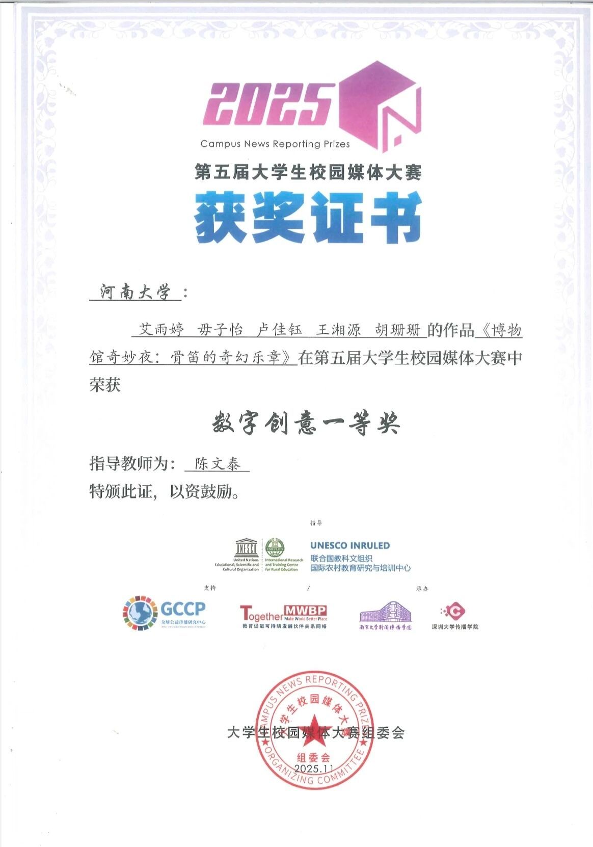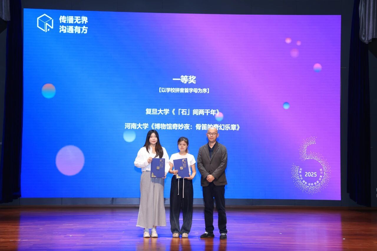 在本次大赛中,由我院视频协会成员(2024级广告学专业艾雨婷、毋子怡;2024级编辑出版学专业卢佳钰;2024级网络与新媒体专业王湘源;2023级编辑出版学专业胡珊珊)集体创作,广告系主任陈文泰指导的作品《博物馆奇妙夜:骨笛的奇幻乐章》获数字创意全国一等奖。