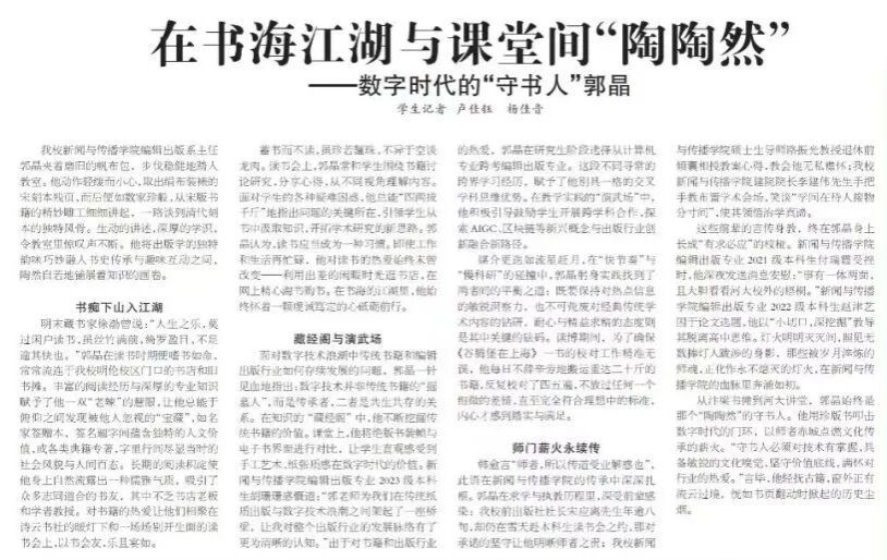 我院编辑出版系主任郭晶老师近日接受校报专访,相关内容见于《河南大学报》第1316期。今天,让我们一起领略他在书海与课堂间“陶陶然”从容自守的执教风采。