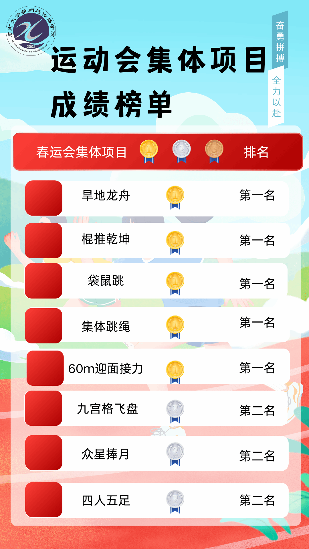 4月15日至17日,河南大学2026年春季运动会顺利举办。新闻与传播学院代表队团结协作、奋勇拼搏,在多项集体项目中斩获优异成绩,充分展现出我院昂扬向上、凝心聚力的良好精神风貌。